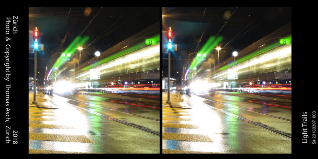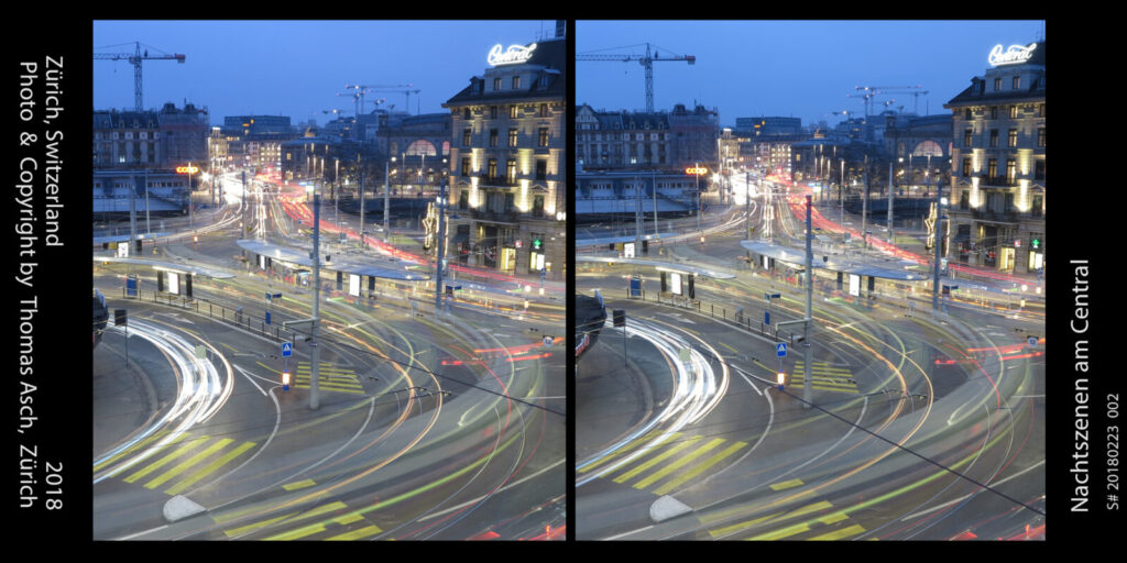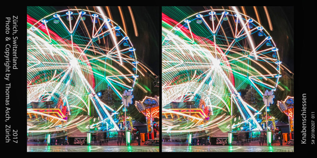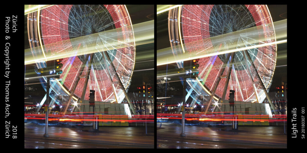 Each light trails project is a new experience in terms of results. Of course, as a photographer, I have a specific idea of the stereo I want to create, and set up my shoot accordingly. Then I observe the lights while shooting and imagine how the final stereo would look. But I make my ultimate decisions during post-processing, and translate my vision in its final form- sometimes I create and “paint” a picture out of a collection of single pics (see the Central stereo), or let a single shot speak for itself (see Knabenschiessen as example)….