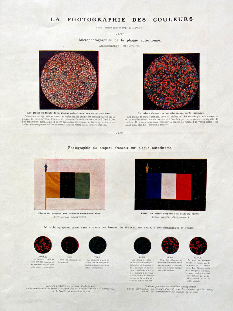 The Autochrome was one of the principal ways of producing colour photography in the early 20th Century. Patented in 1904 by the brothers Auguste and Louis Lumière, the process consisted of a glass plate coated with a microscopic layer of mixed potato starch granules dyed orange-red, green and blue-violet. This created a random mosaic screen in which each particle of starch acted as a colour filter and then a black and white silver emulsion was coated on top. The plate was placed in the camera, back to front with the mosaic screen facing towards the lens. During Exposure, light hitting the surface of the starch would split into its additive colours of red, green and blue before reaching the photosensitive surface beneath. The plate is then put through a ‘reversal process’ which involves developing the exposed negative image and then bleaching it away using an acid. This leaves the un exposed silver which is then fogged with light and re developed to produce a positive image. When viewed through transmitted light the random pattern of the microscopic grains would recreate the original colour of the scene.