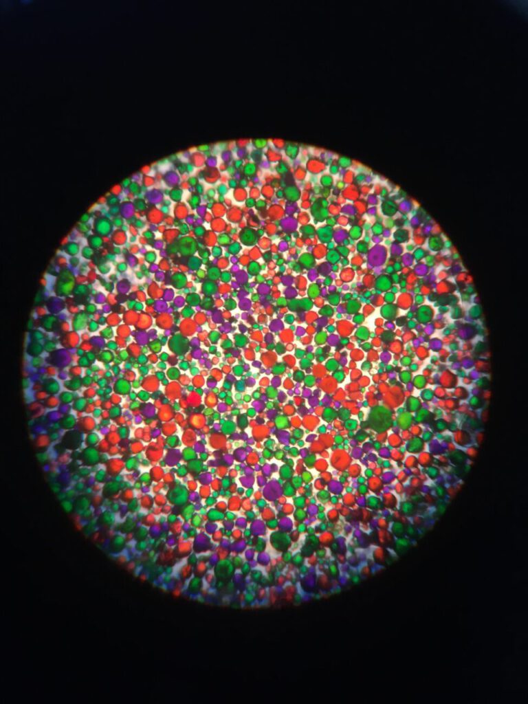 These characteristics have formed my reasons for wanting to be able to explore and use the colour palette for making photographs on glass. Following a revival of learning and practice in early photographic processes this has increased the knowledge and interest of these techniques. Due to the complexity of the Autochrome production I feel an alternative method of reproducing this process needs to be considered. By drawing from the original Lumiere research materials reproduced in ‘The Lumiere Autochrome, History, Technology & Preservation’ by Bertrand Lavedrine and Jean Paul Gandolfo, this has provided me with a foundation to how this could be possible. By breaking down the process into its constituent parts, alternative ways of looking at each stage can be achieved. This has consisted of research into dyeing different starches, how it is applied onto glass and how this can be coated with photographic chemistry.