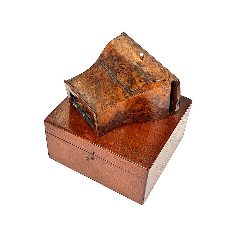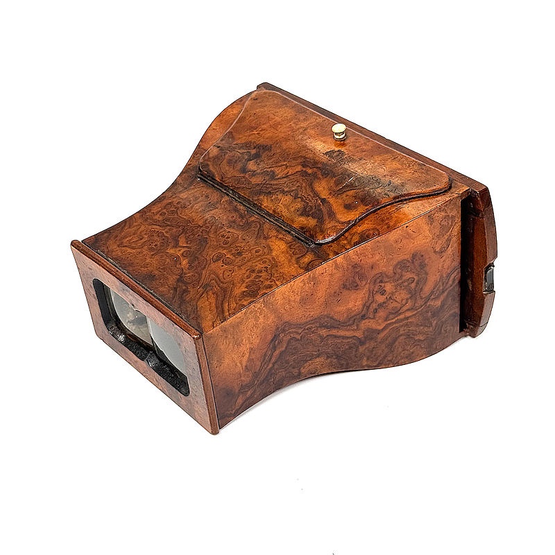 About this objectA Brewster-type stereoscope is a refracting hand-held stereoscope introduced by David Brewster in 1849. The device was later developed into a viewer with an enclosed housing. This modification occurred largely in response to the use of daguerreotype stereoviews, which exhibited high surface reflectivity and therefore required shielding from ambient light. A hinged lid was added to the top of the viewer in order to direct incident light onto the daguerreotype and, subsequently, onto paper stereoviews. Jules Duboscq later incorporated a ground glass element to enable illumination of glass stereoviews by transmitted light.