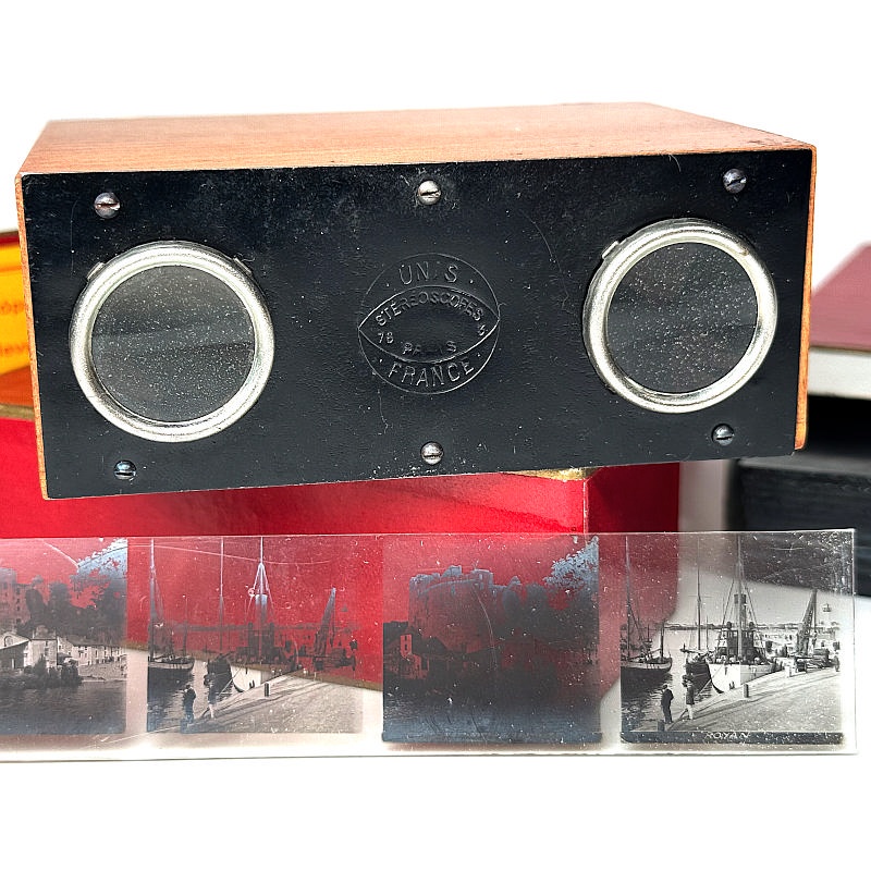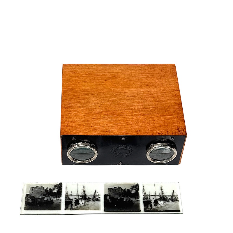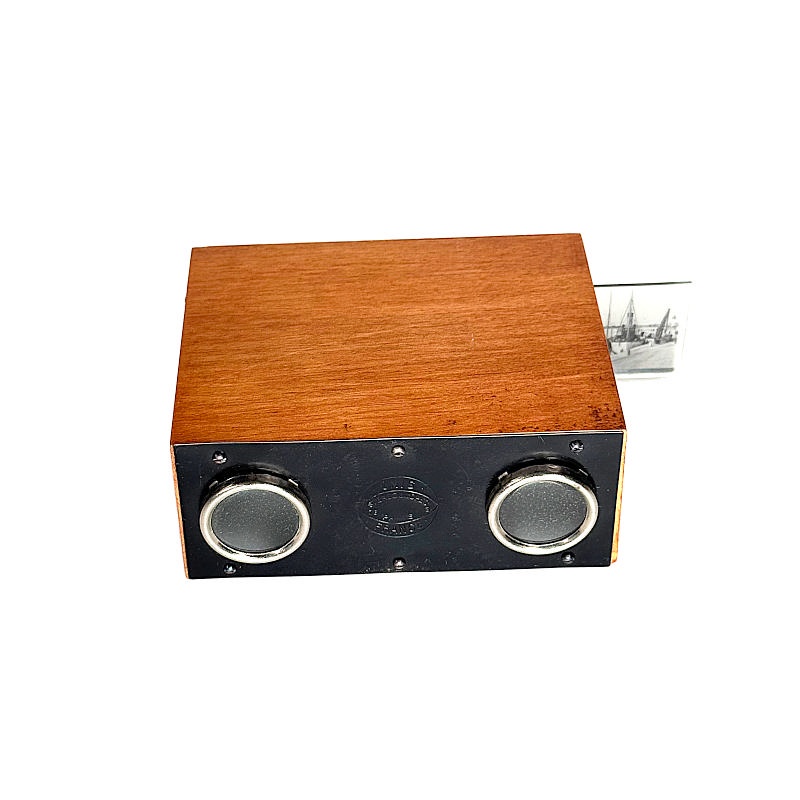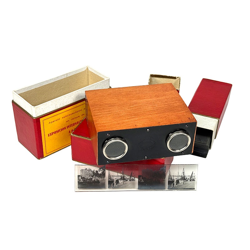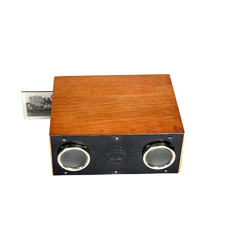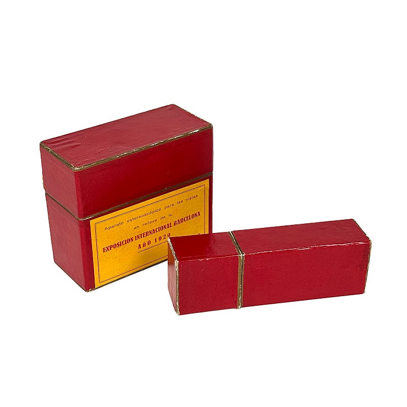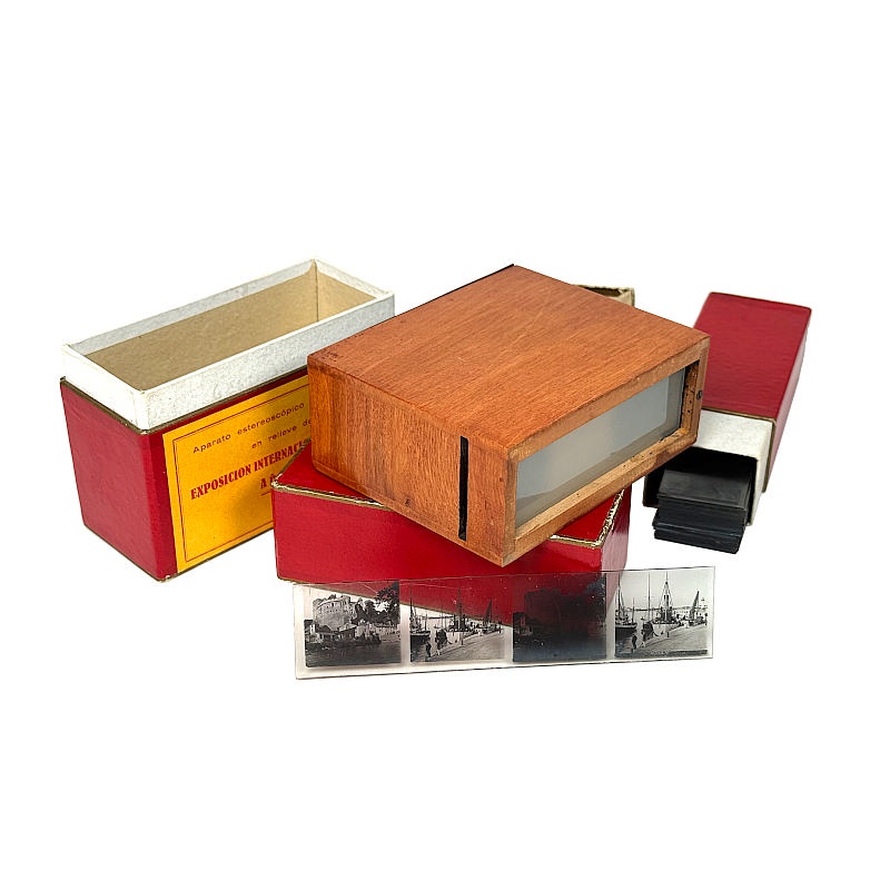 The illustrated viewer comprises only the viewing unit. It was produced exclusively for the International Exhibition in Barcelona in 1929. It functions similarly to the Alternascope, except that there is no vertical movement, and the slides consist only of rows from the original 13 × 18 cm plates. In this way, each slide contains two stereoscopic pairs.