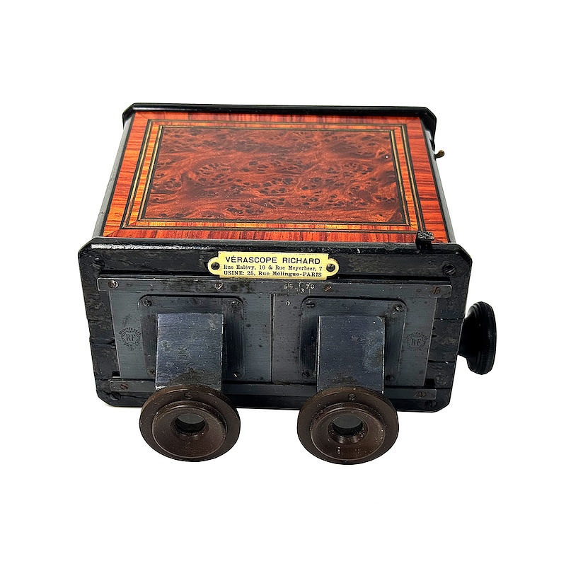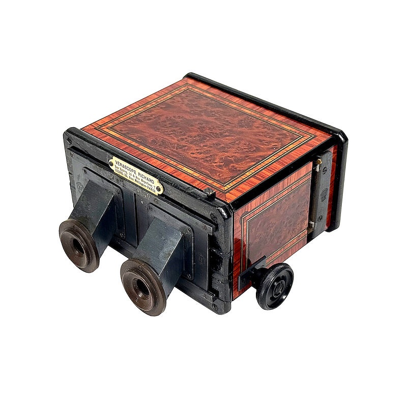 About this objectThe Stéréoscope redresseur makes it possible to correctly view stereoviews that have not been transposed. The viewer achieves this by means of two types of prism lenses. This combination produces a lateral correction (left–right reversal) of the images. It performs the same function as swapping the left and right images, but optically rather than physically.