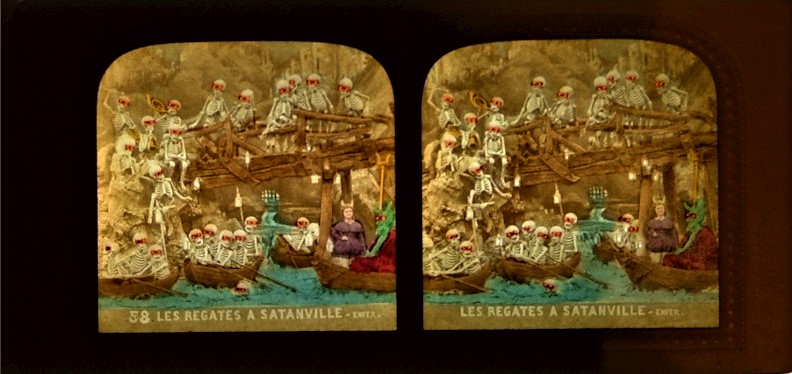 In the 1860s the French were unhappy with Napoleon III, but with no freedom of speech, couldn’t express their displeasure. They also loved all things devilish. Photography provided a perfect outlet combining these through stereos, especially tissue views. Two photographers/ sculptors, created dioramas depicting life in Hell peopled by Satan and his skeletons. Their first views were religious to bypass the censors, but soon scenes made veiled comments on the Emperor, which evolved into purely humorous views.